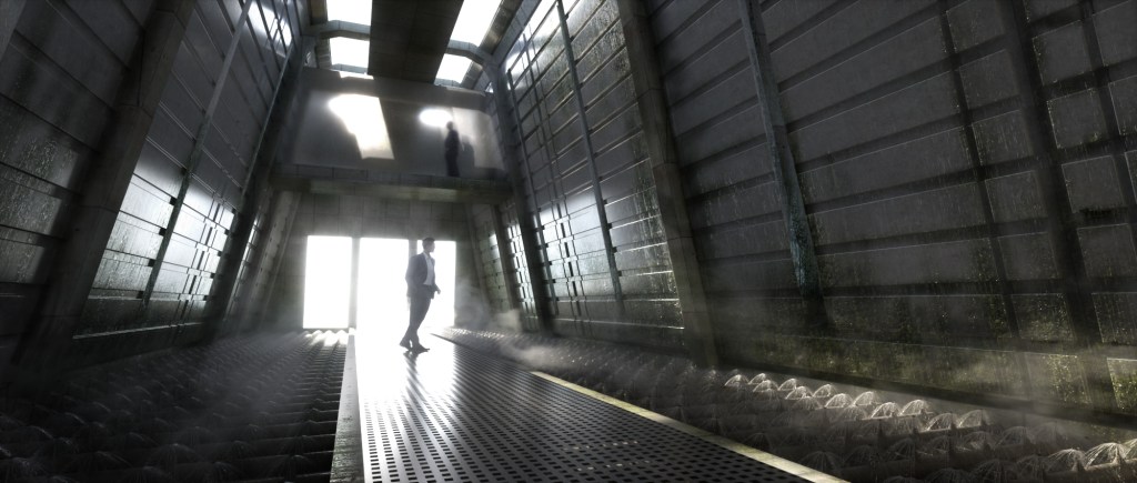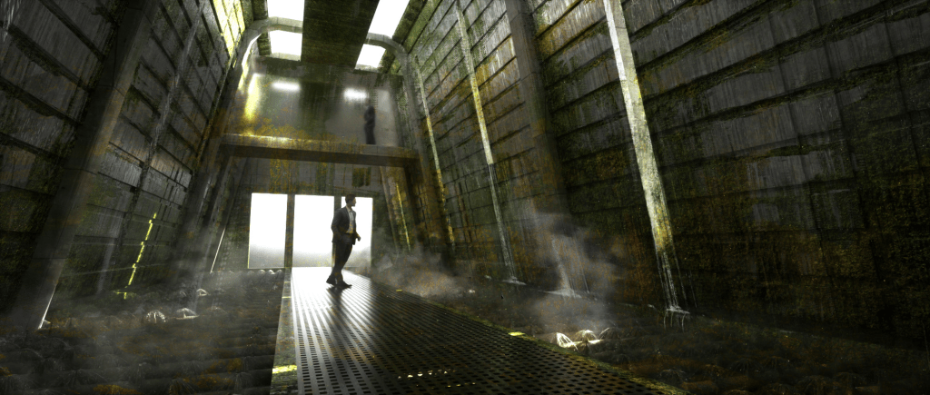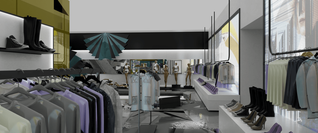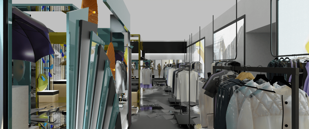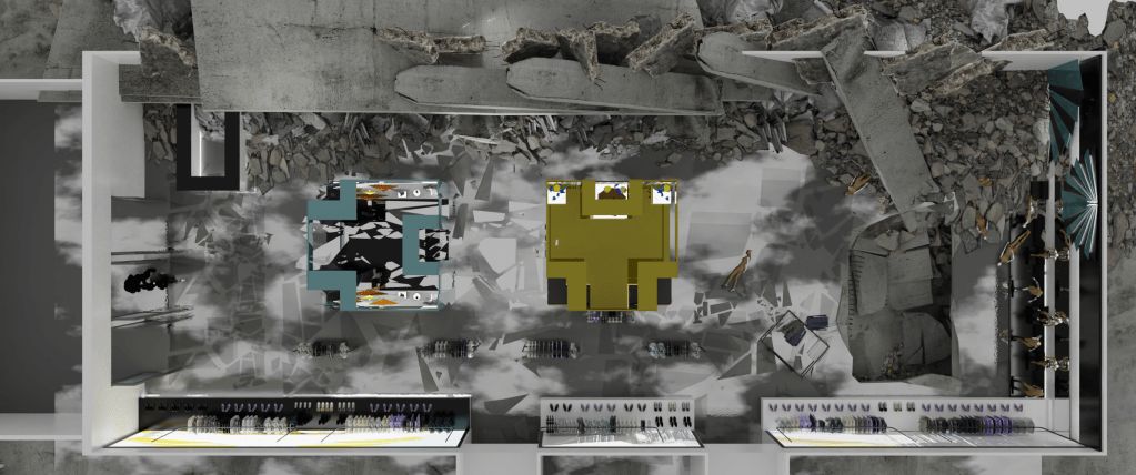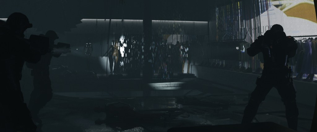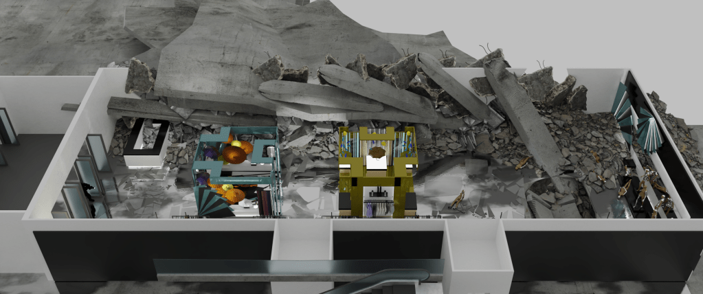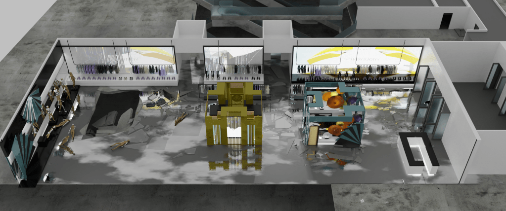 A 3d blockout of the structure of the building was delivered by production to work on, with basic placemente of walls, floor heights and columns. The middle structures was a back and forth with Art Director Virginie Bourdin and concept artist Josu Solano, to come up with a fun theme for the store and something that would provide interesting shots with all the atmosphere around.
