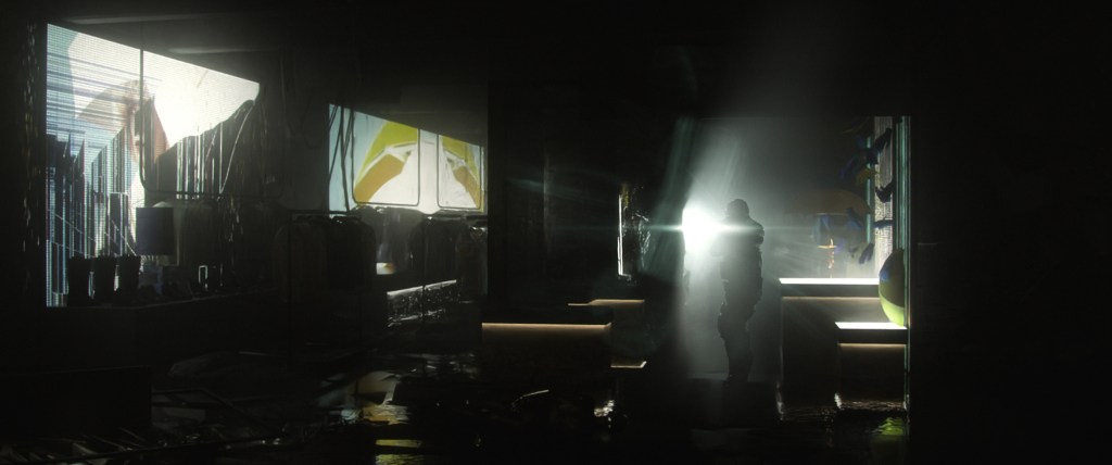 I worked on the general dressing of the set, populating the scene with clothes, shoes and so on; I also provided some materials for the glitched screens. Later on Josu did all the paintovers to sell the mood.