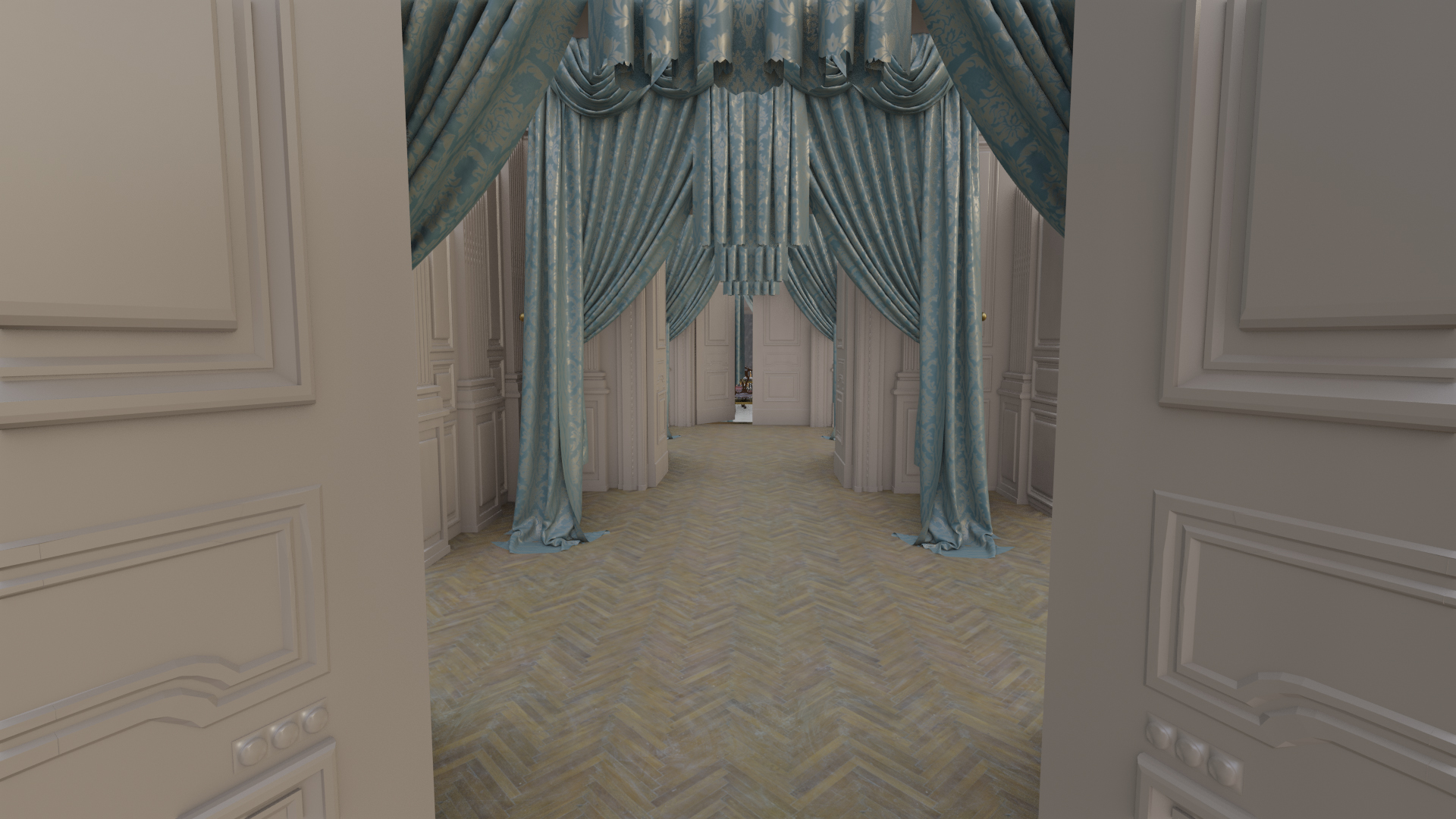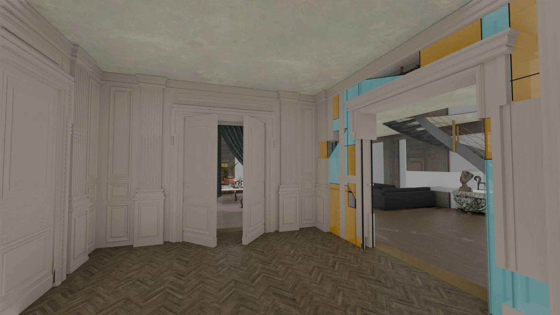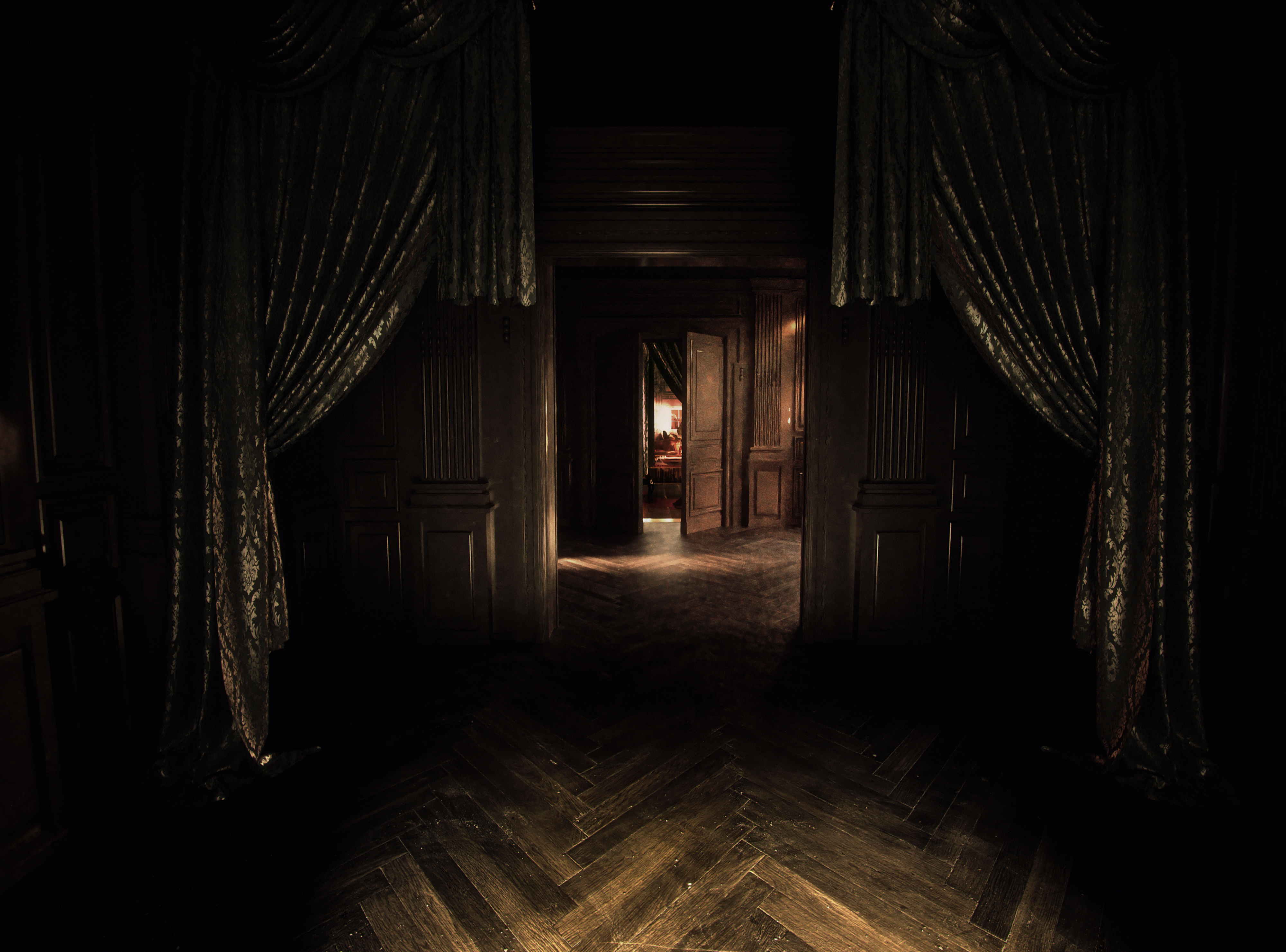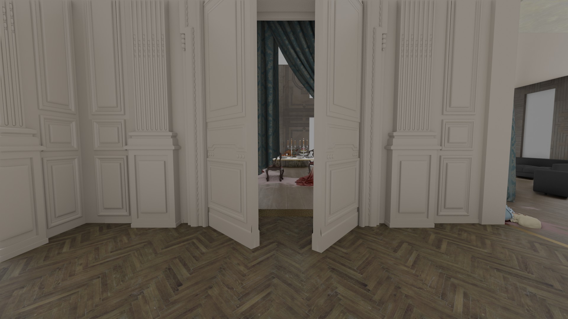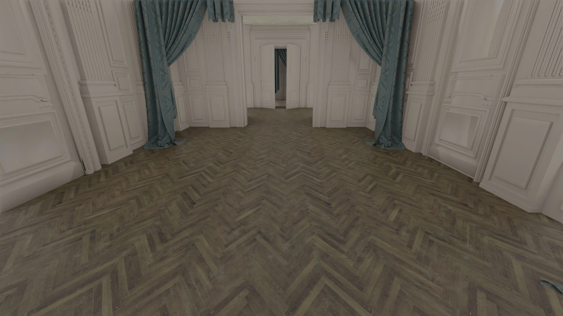 Based on an initial block-in by Production Designer Andy Nicholson, I mainly handled the classical decoration of the corridor leading into the living room where the gore scene takes place, while also helping on the living room itself by creating textures for the mural.